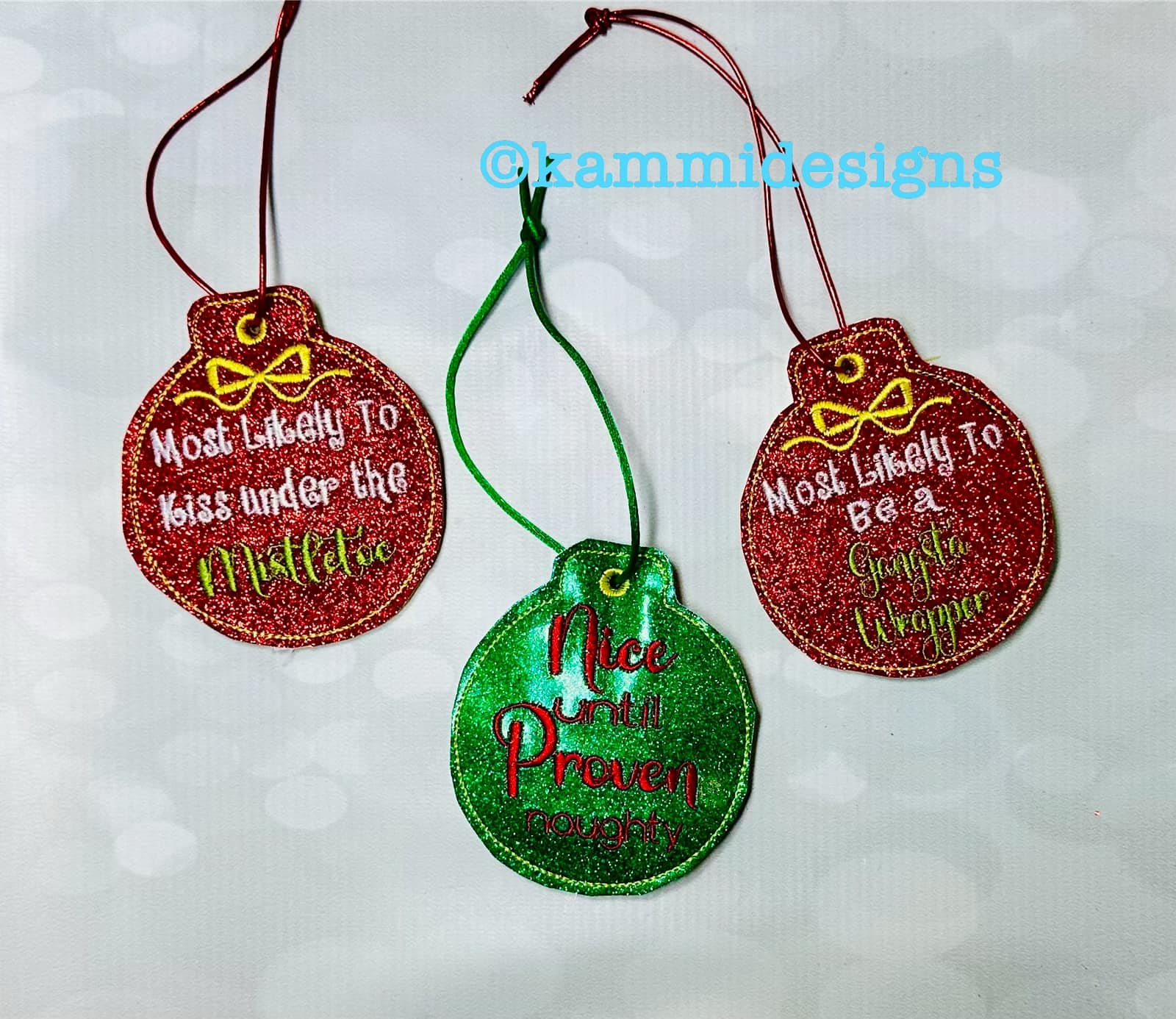 This listing is for a set of 3 In the hoop Christmas Funny Saying Ornament Designs.