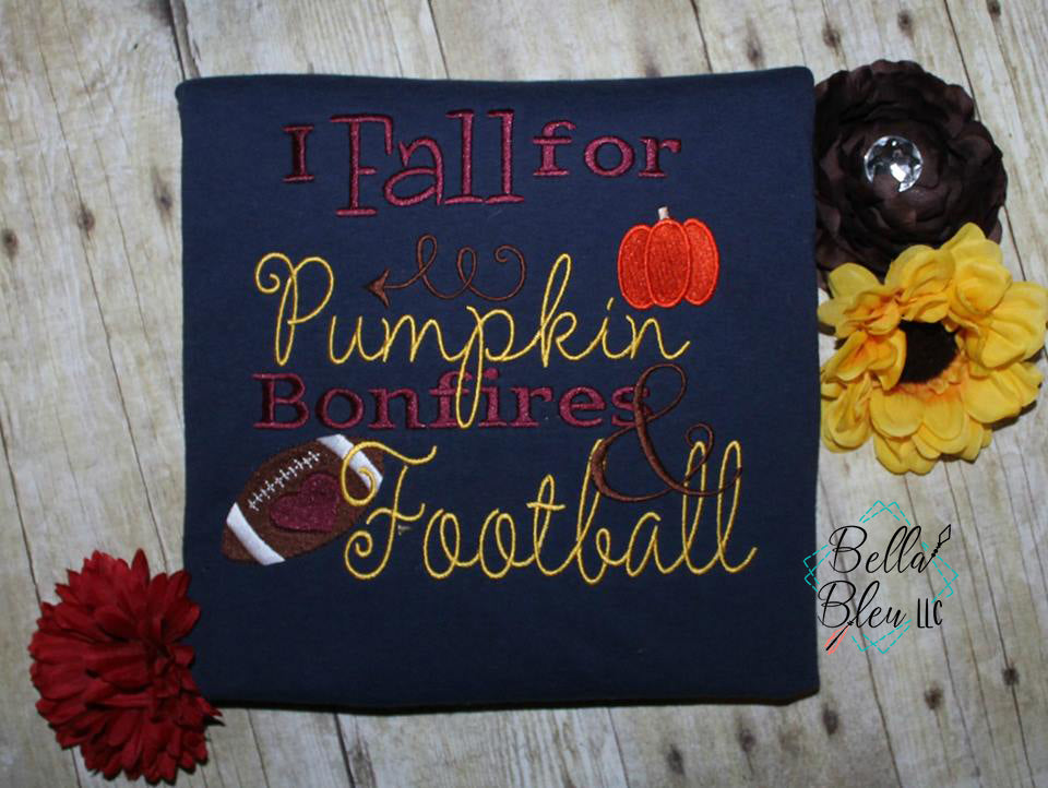 "I fall for pumpkins, bonfires and football" embroidery design saying