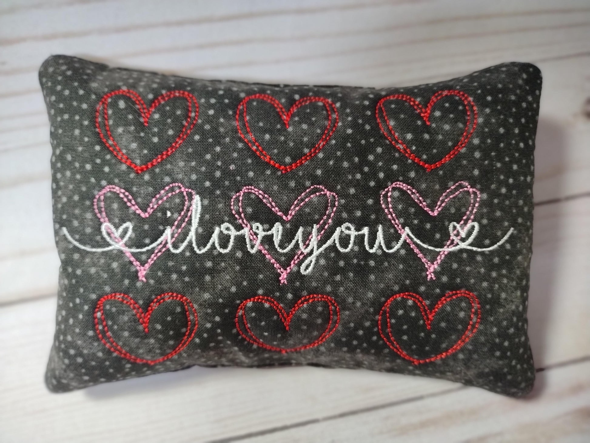 I love you saying pillow with bean stitch hearts as an in the hoop embroidery design. it comes in 4 sizes