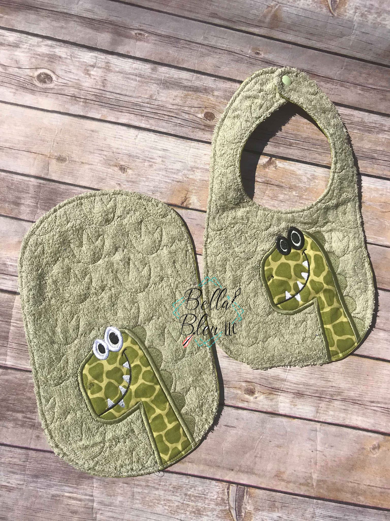 Adorable set of in the hoop baby burp with T-Rex Dinosaur machine embroidery design
