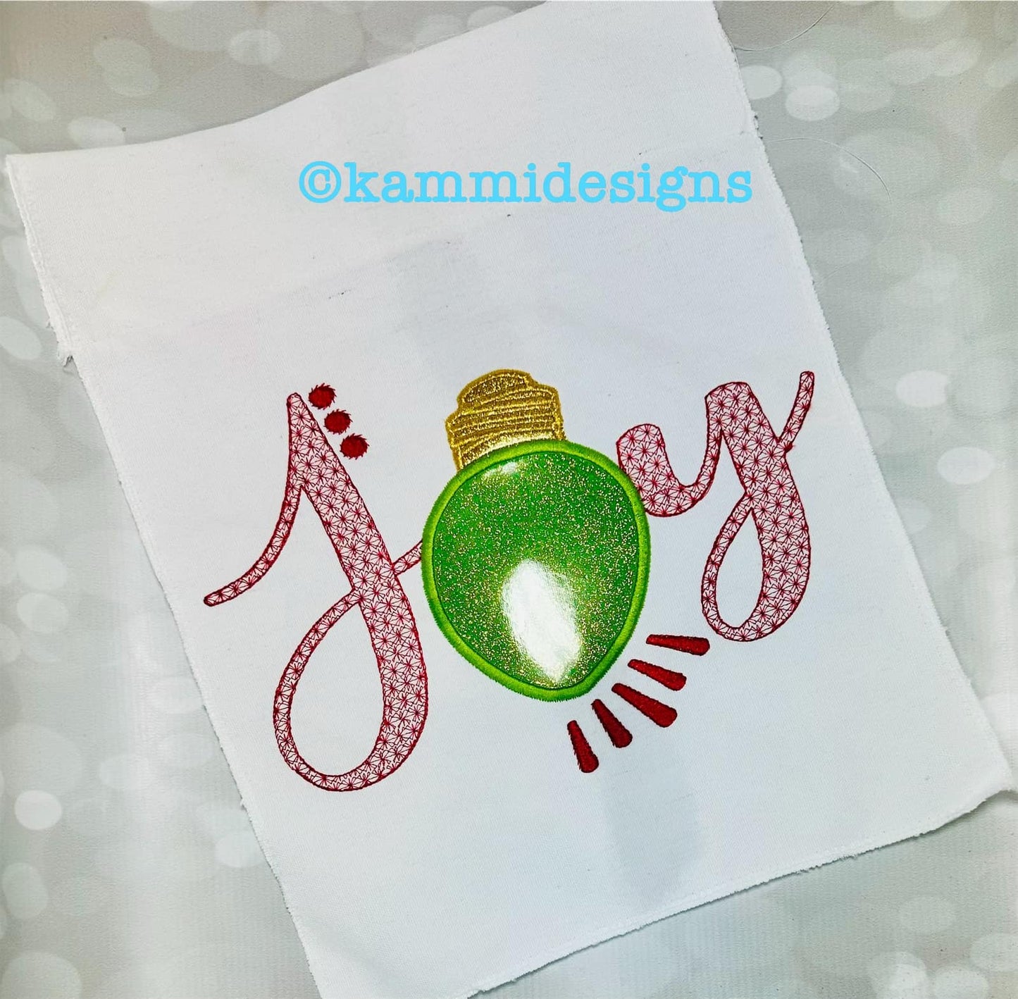 Joy saying with an applique Christmas Bulb for the "o" embroidery design.