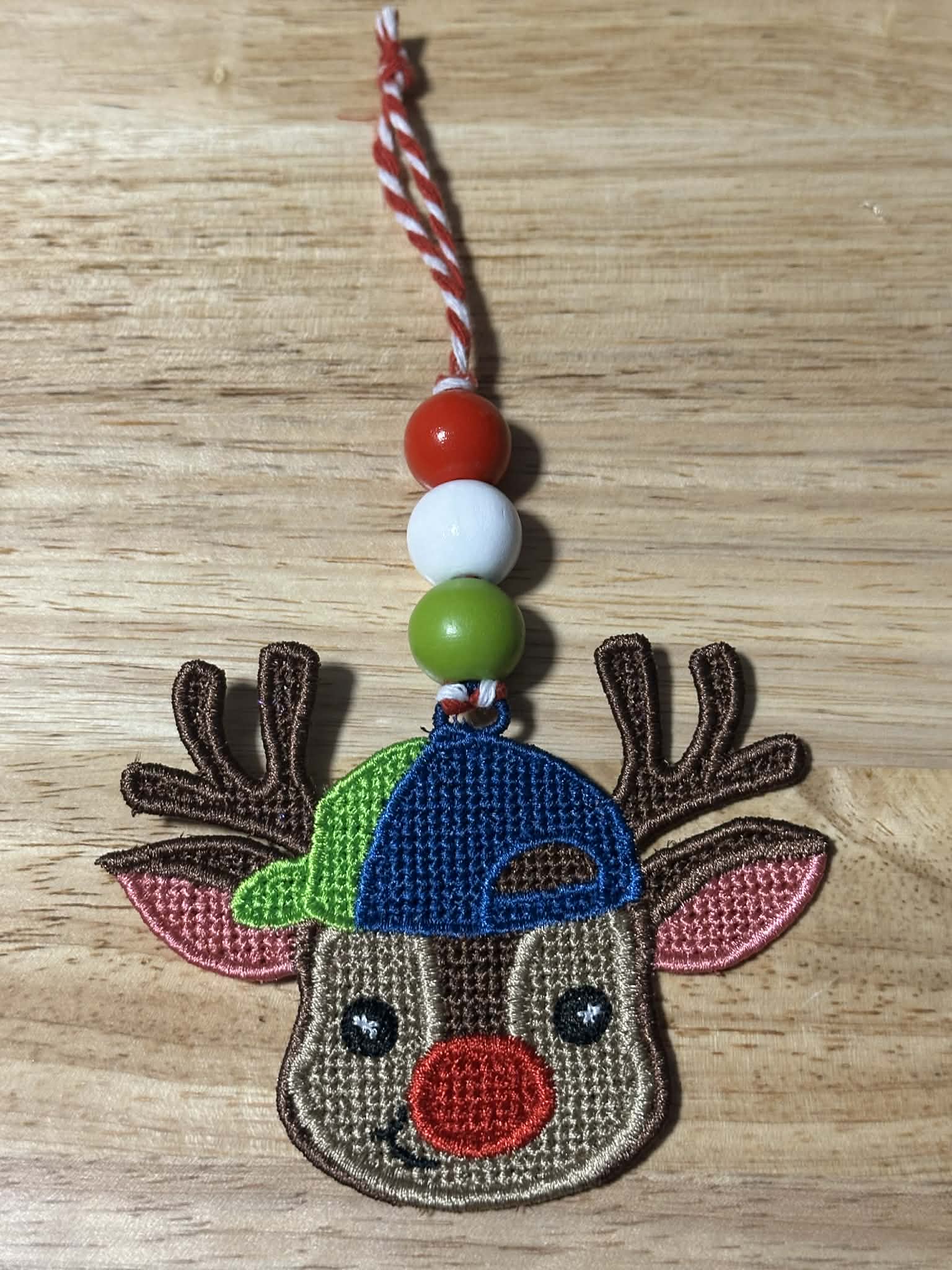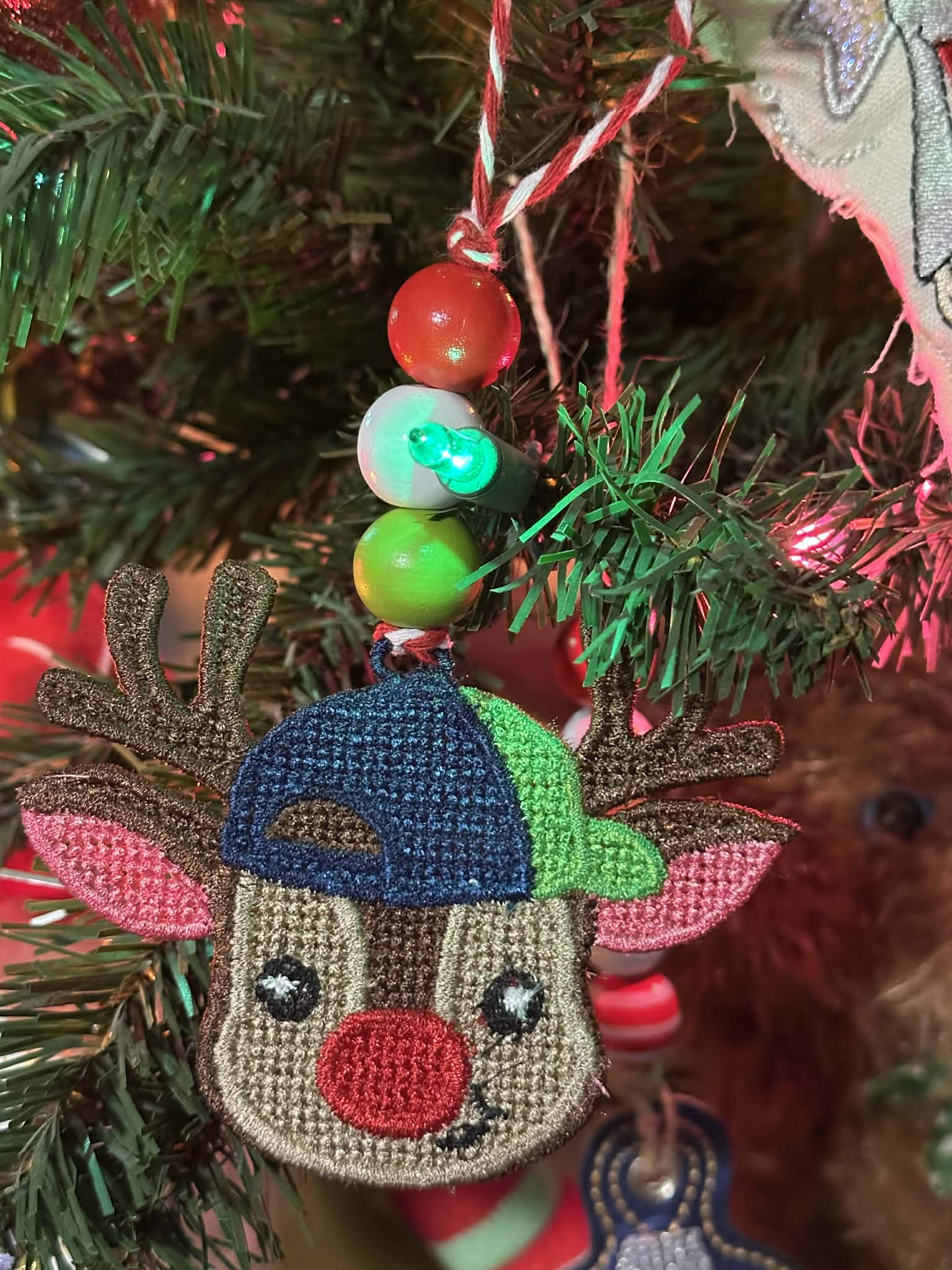 ITH Free standing lace ornament of a Reindeer boy wearing a baseball cap