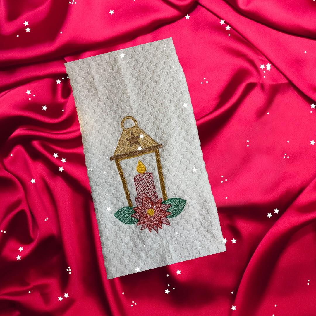 Beautiful sketchy Christmas design of a Lantern with a candle inside and some poinsettias on the front.