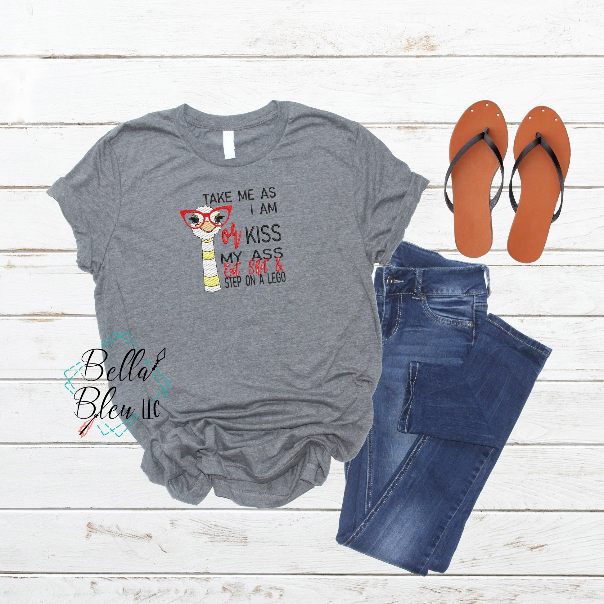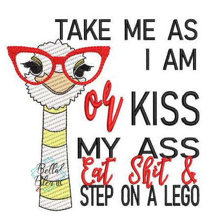Sketchy Ostrich with Glasses "Take me as I am or kiss my ass eat shirt & step on a lego" saying